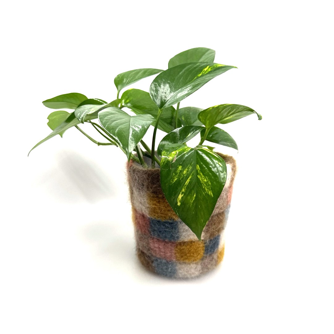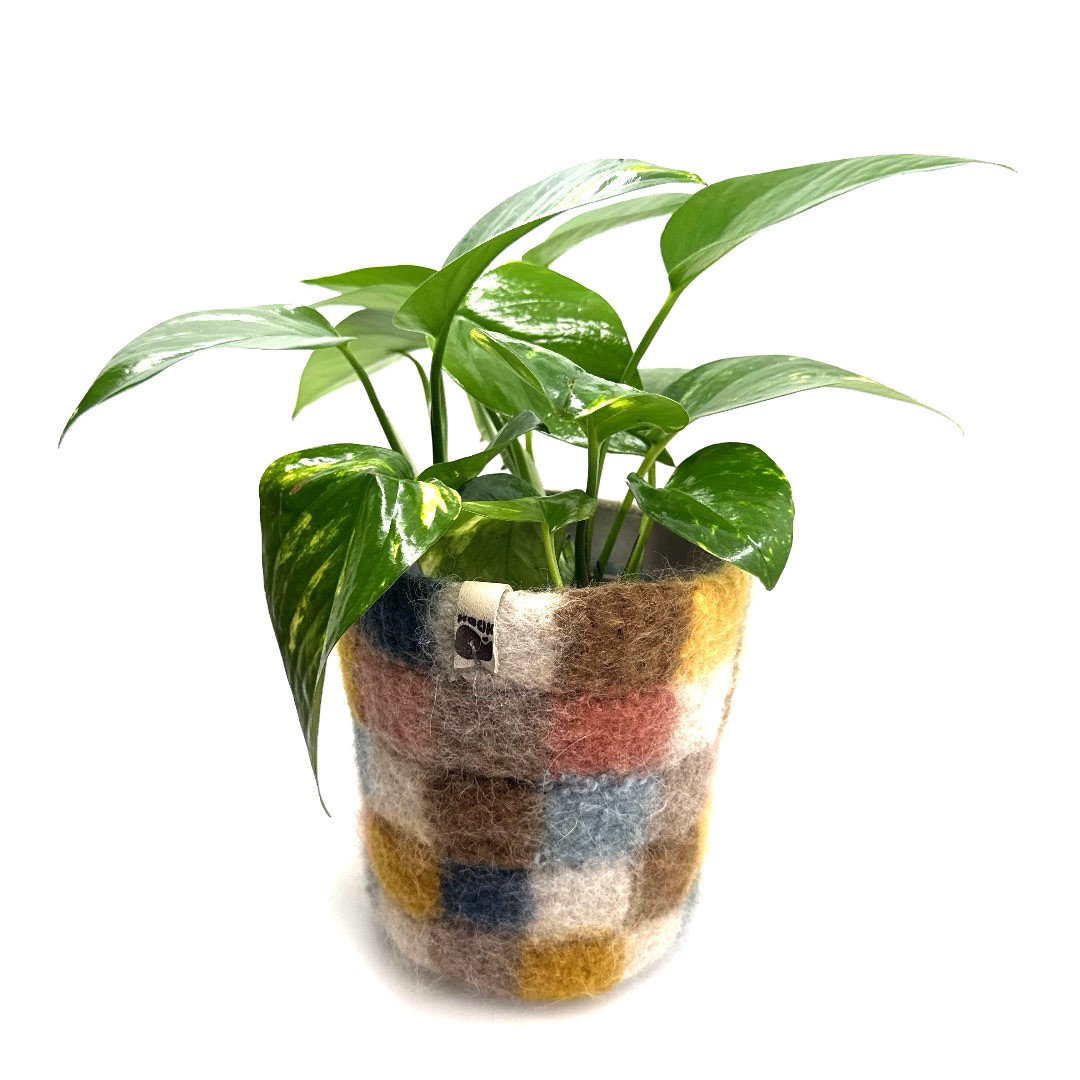 Bloempot in vervilte wol, blokjesmotief. Hoogte 16 cm, diameter 16 cm.