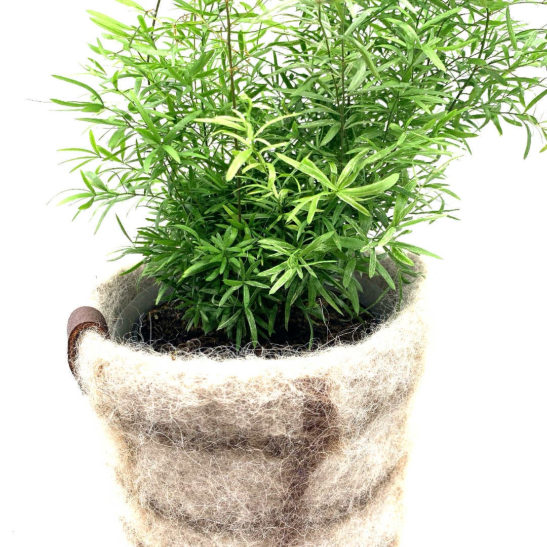 Handgemaakte bloempot uit vervilte wol. Wordt verkocht samen met bijpassende plastiek inzethoes. Afmetingen: hoogte 14cm, diameter 22cm.