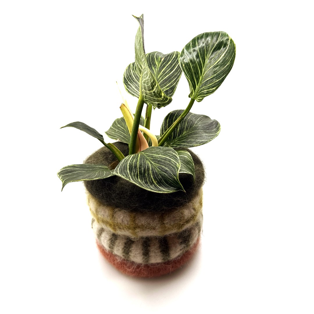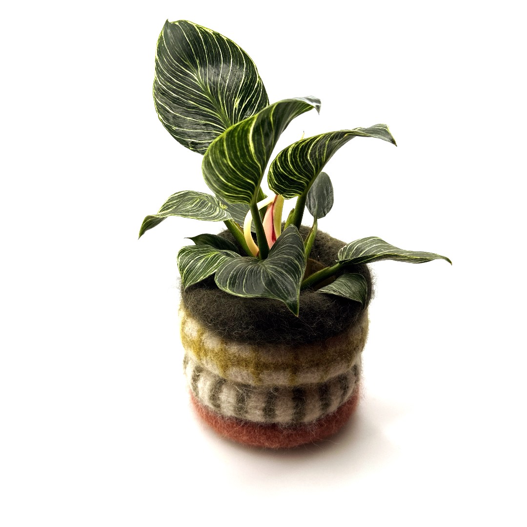 Bloempot opgebouwd uit 4 ringen in vervilte wol. 1 ring in effen woudgroen, 1 ring woudgroen en wit geruit, 1 ring burgundy en wit gestreept, 1 ring effen burgundy. Met plastiek container binnenin. Hoogte 14 cm, diameter 13 cm.