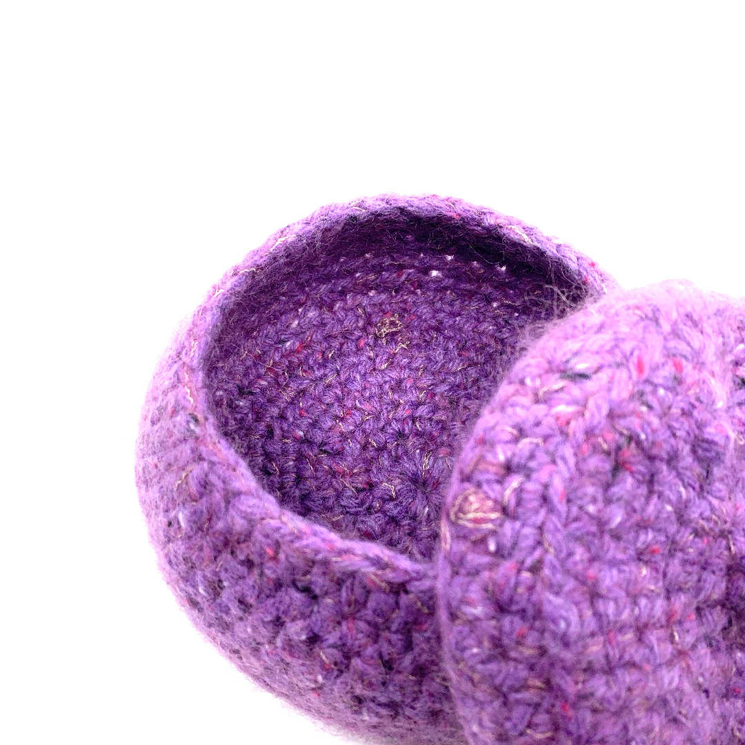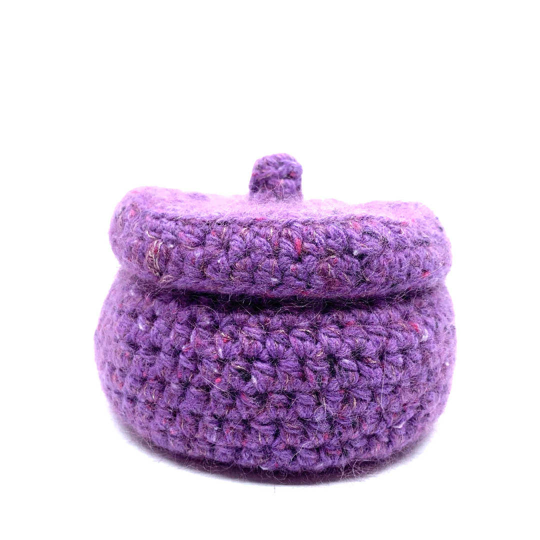 Potje met deksel, geschikt als bv juwelendoosje, opberger voor kleine bureauspullen... Totale hoogte 10 cm, diameter 12 cm. Gemaakt uit 100% wol.