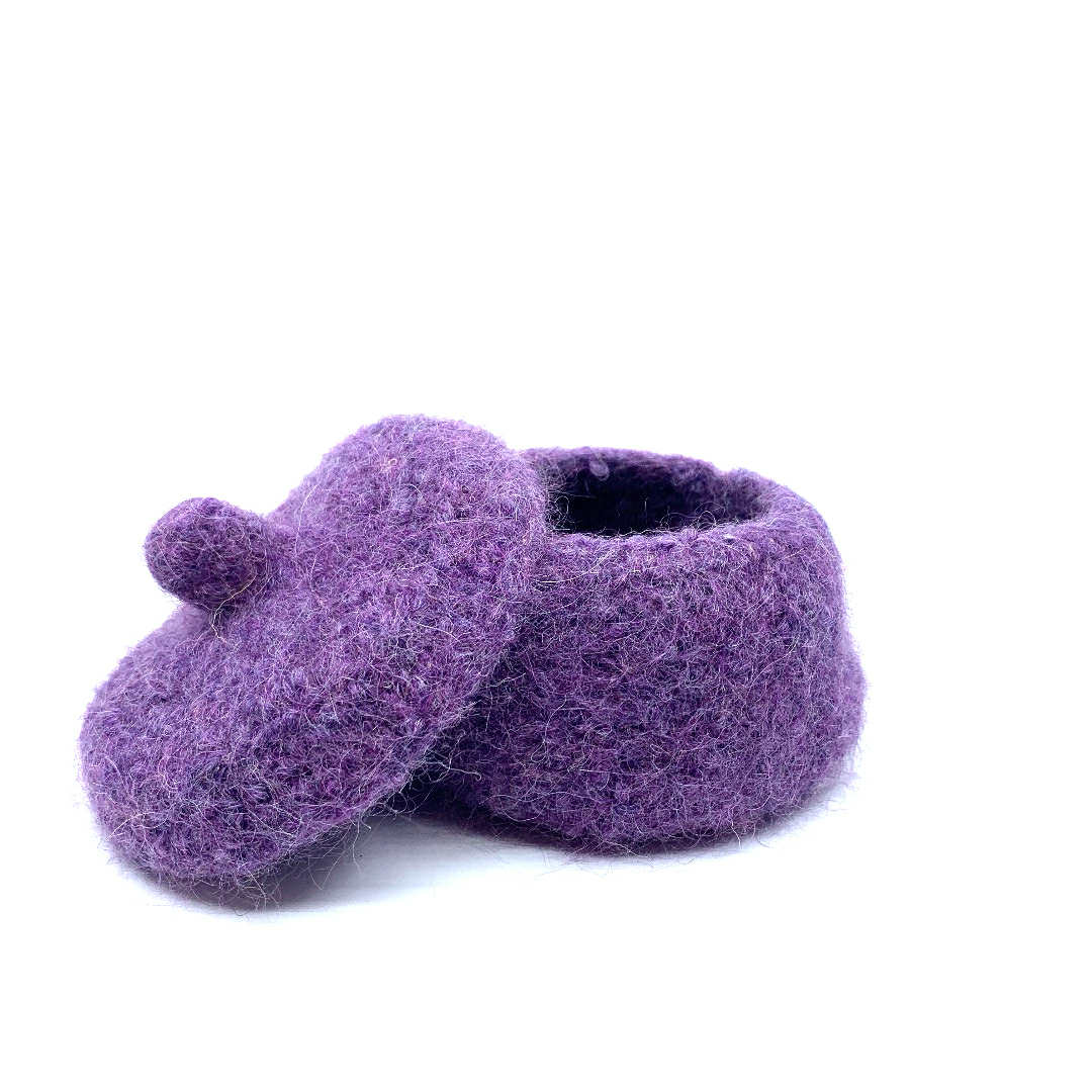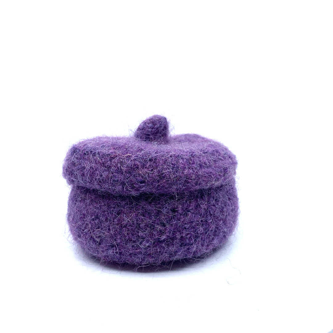Potje met deksel, geschikt als bv juwelendoosje, opberger voor kleine bureauspullen... Totale hoogte 6 cm, diameter 10 cm. Gemaakt uit 100% wol.