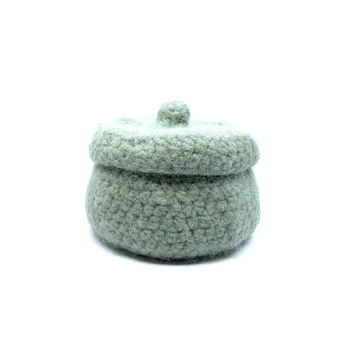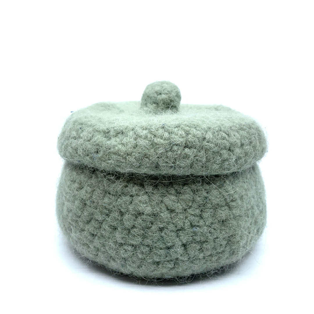 Potje met deksel, geschikt als bv juwelendoosje, opberger voor kleine bureauspullen... Totale hoogte 10 cm, diameter 12 cm. Gemaakt uit 100% wol.