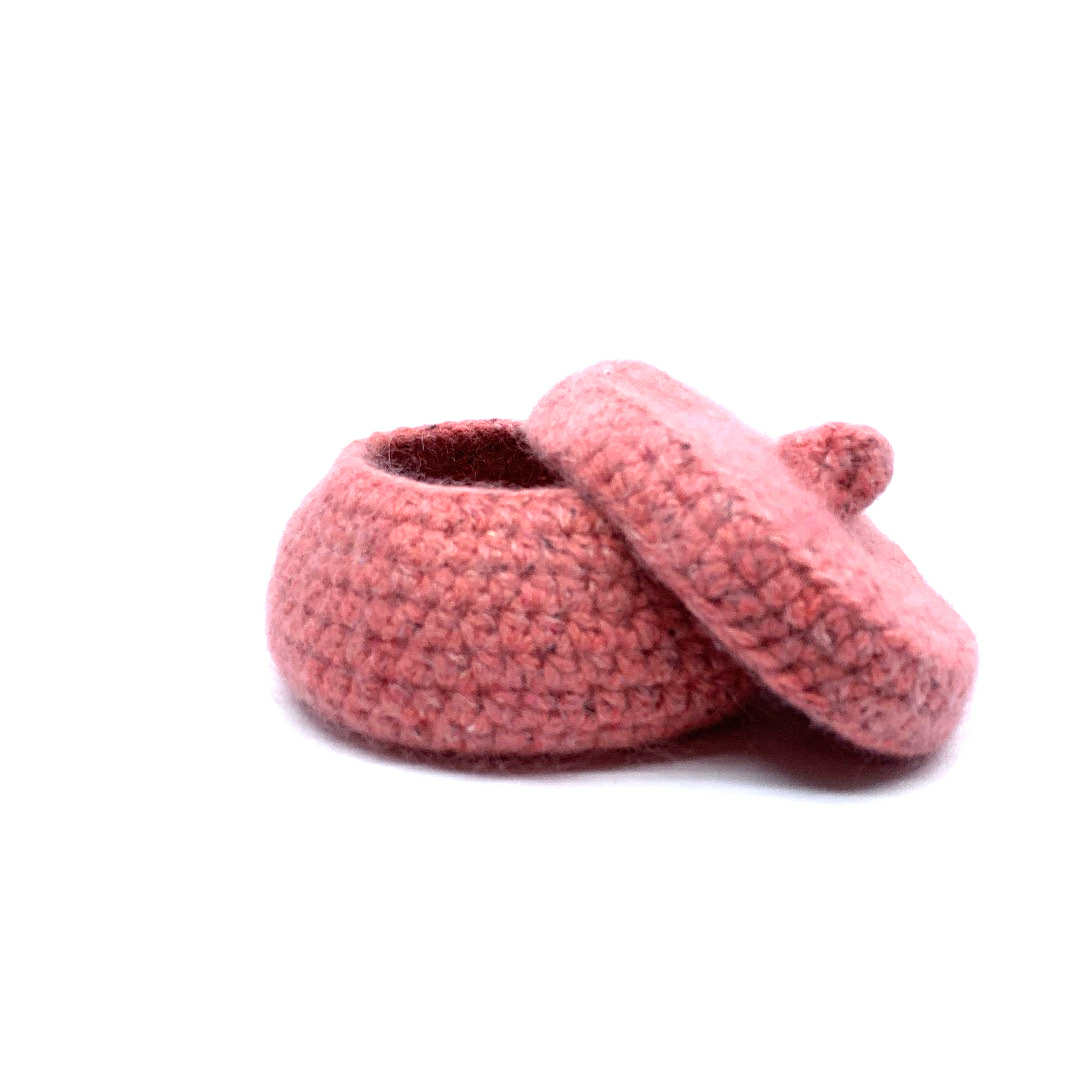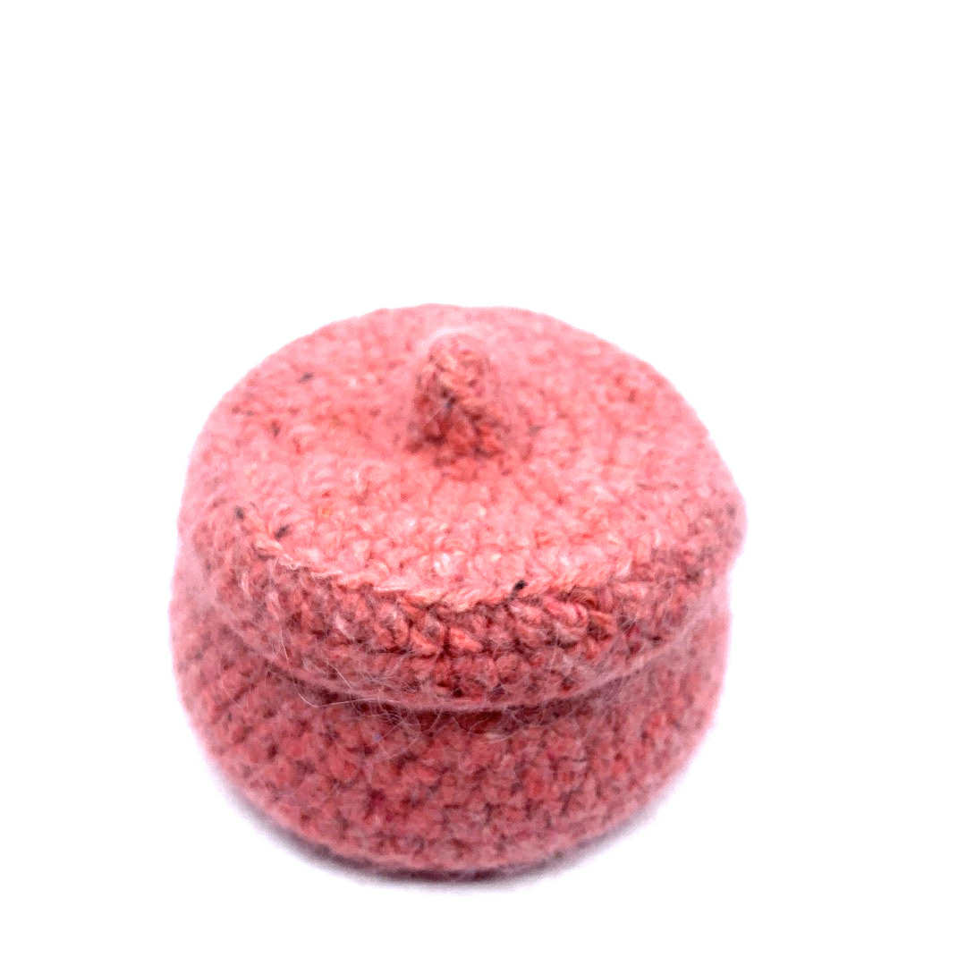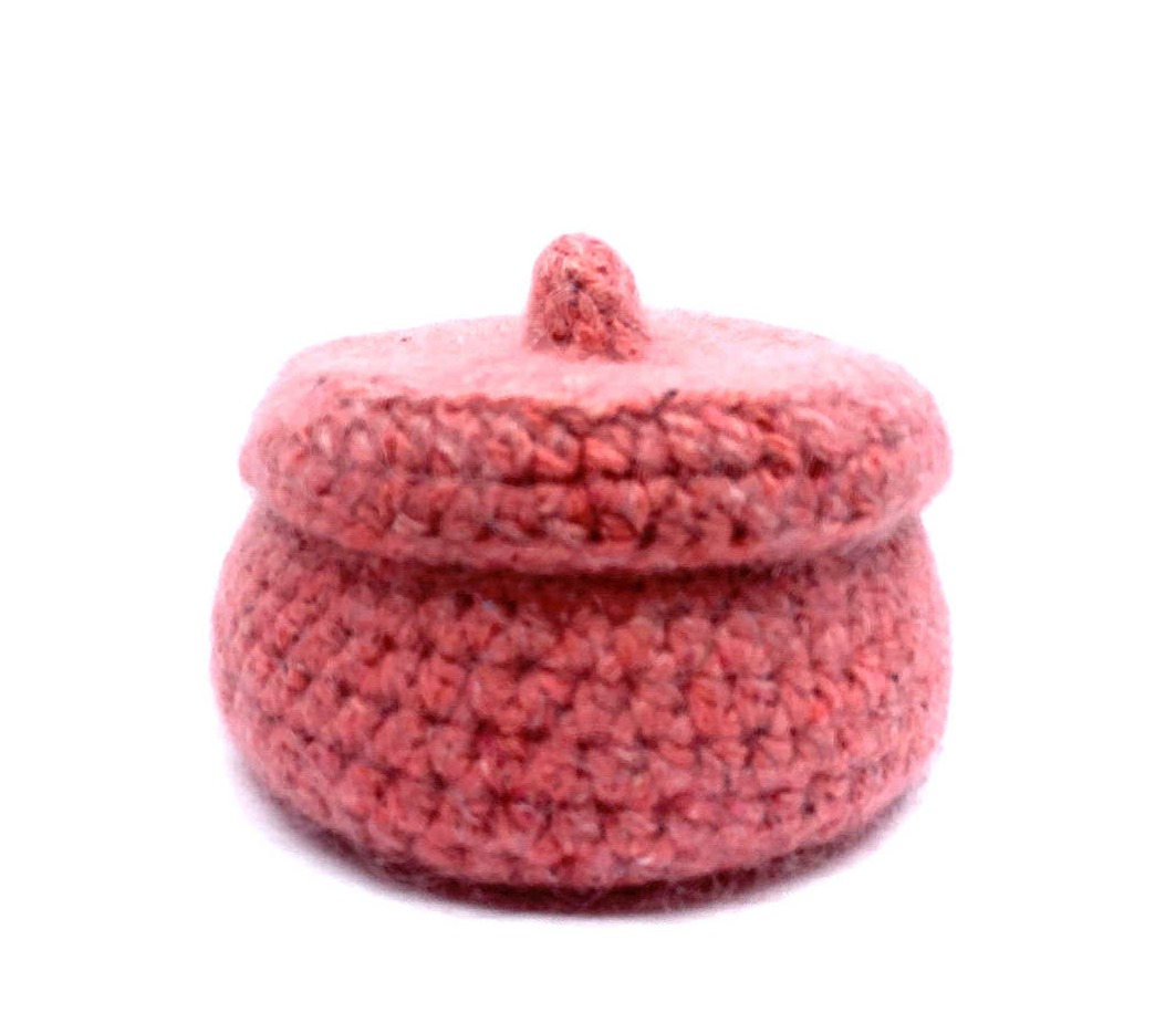 Potje met deksel, geschikt als bv juwelendoosje, opberger voor kleine bureauspullen... Totale hoogte 10 cm, diameter 12 cm. Gemaakt uit 100% wol.