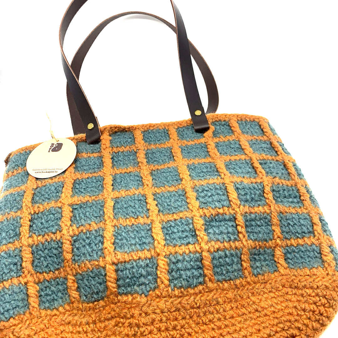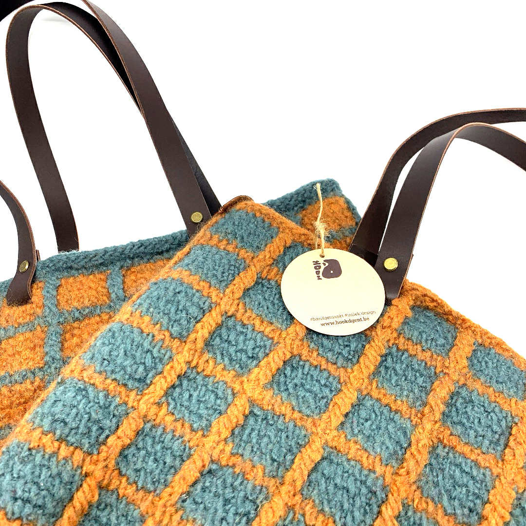 Shopper met lederen schouderrriemen. Hoogte 22cm, breedte 35 cm, diepte 12cm.