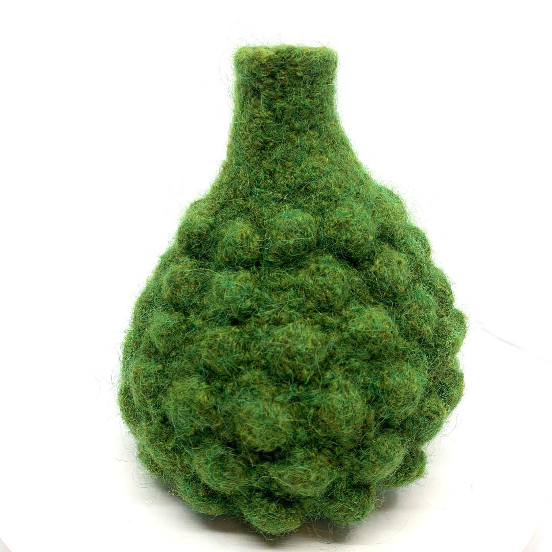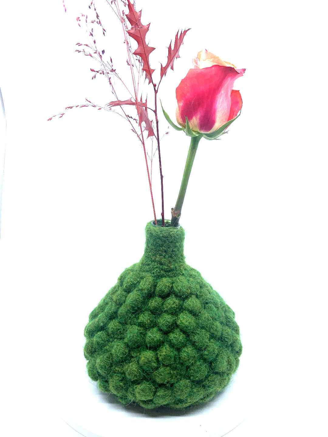 Vaas in vervilte wol met binnenin glazen proefbuis voor echte bloemen. Hoogte 16cm.