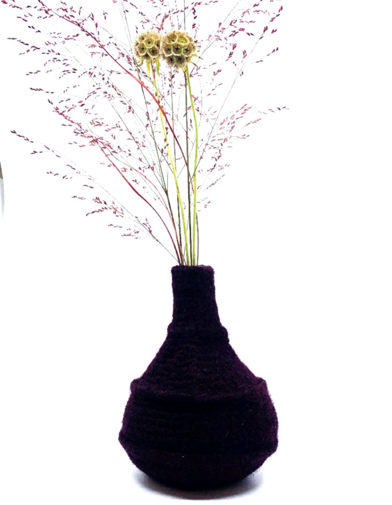 Vaas in vervilte wol met binnenin glazen proefbuis, kan gebruikt worden voor echte bloemen. Hoogte 20cm. Te koop bij Tiftik Avelgem of hier online te bestellen