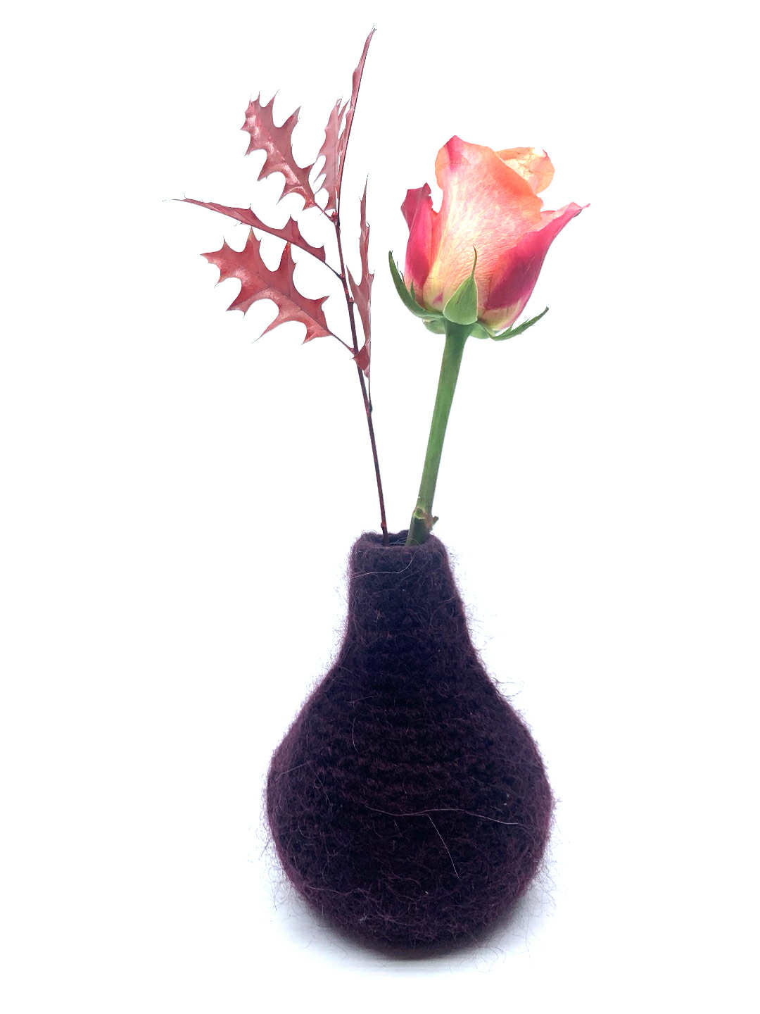 Vaas in vervilte wol met binnenin glazen proefbuis, kan gebruikt worden voor echte bloemen. Hoogte 18cm. Te koop bij Onderhuids Oudenaarde of hier online te bestellen